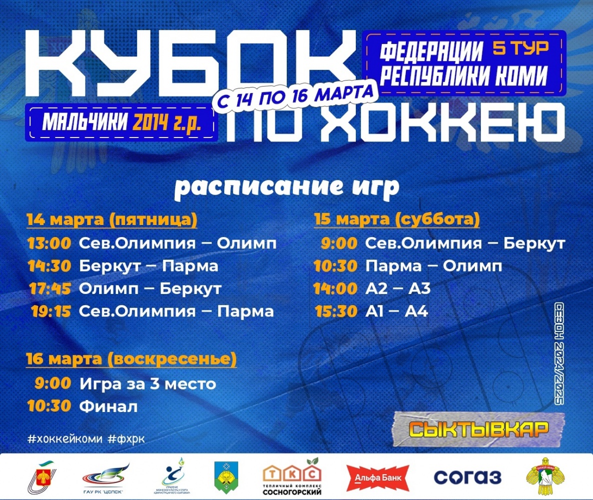 С 14 по 16 марта на ледовой арене «Северная Олимпия» пройдет пятый тур «Кубка Федерации Республики Коми по хоккею среди мальчиков 2014 года рождения».