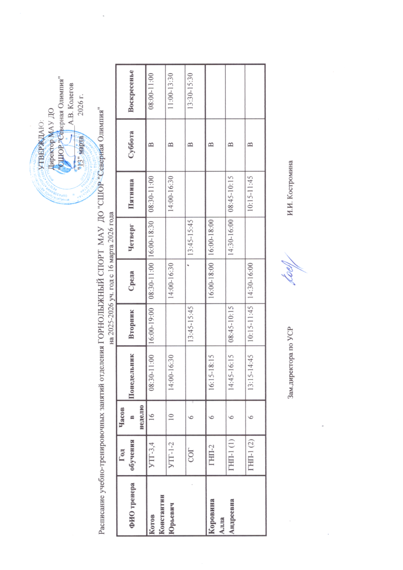 Расписание учебно-тренировочных занятий отделения «Горнолыжный спорт» с 01.03.2026 г. (ул. Тентюковская, 333)
